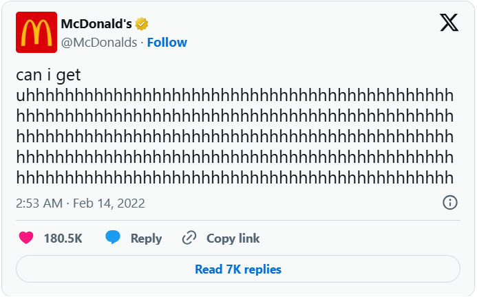 مکدونالدز در سال ۲۰۲۲ یک تبلیغ تلویزیونی را در جریان مسابقه Super Bowl منتشر کرد؛ تبلیغی که به یک موقعیت کاملا آشنا اشاره میکرد: لحظهای که مشتریها پای منو مکدونالدز میرسند و نمیدانند دقیقا چه سفارش دهند و میگویند: «آآآ… میشه…». همین موقعیت ساده، موجی از شوخیها و بازنشرها را در توییتر بهوجود آورد.